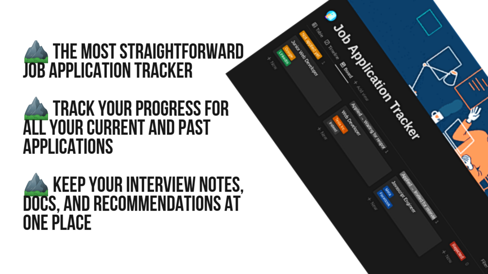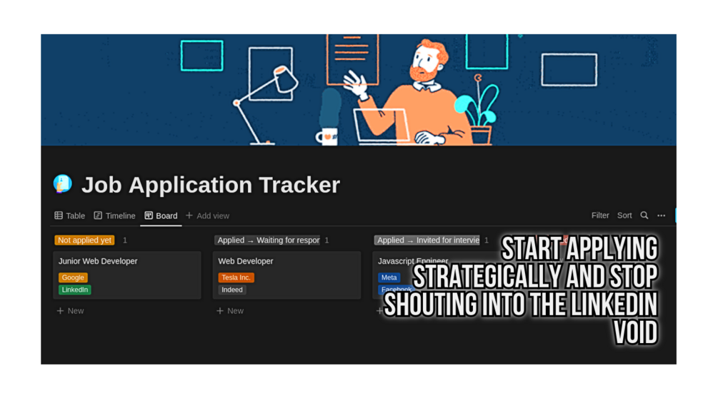 This Notion template will help you bring order to the job application process. With the useful timeline and Kanban board views, you will be able to track the deadlines for applications and inspect the best strategies to optimise your career progression.